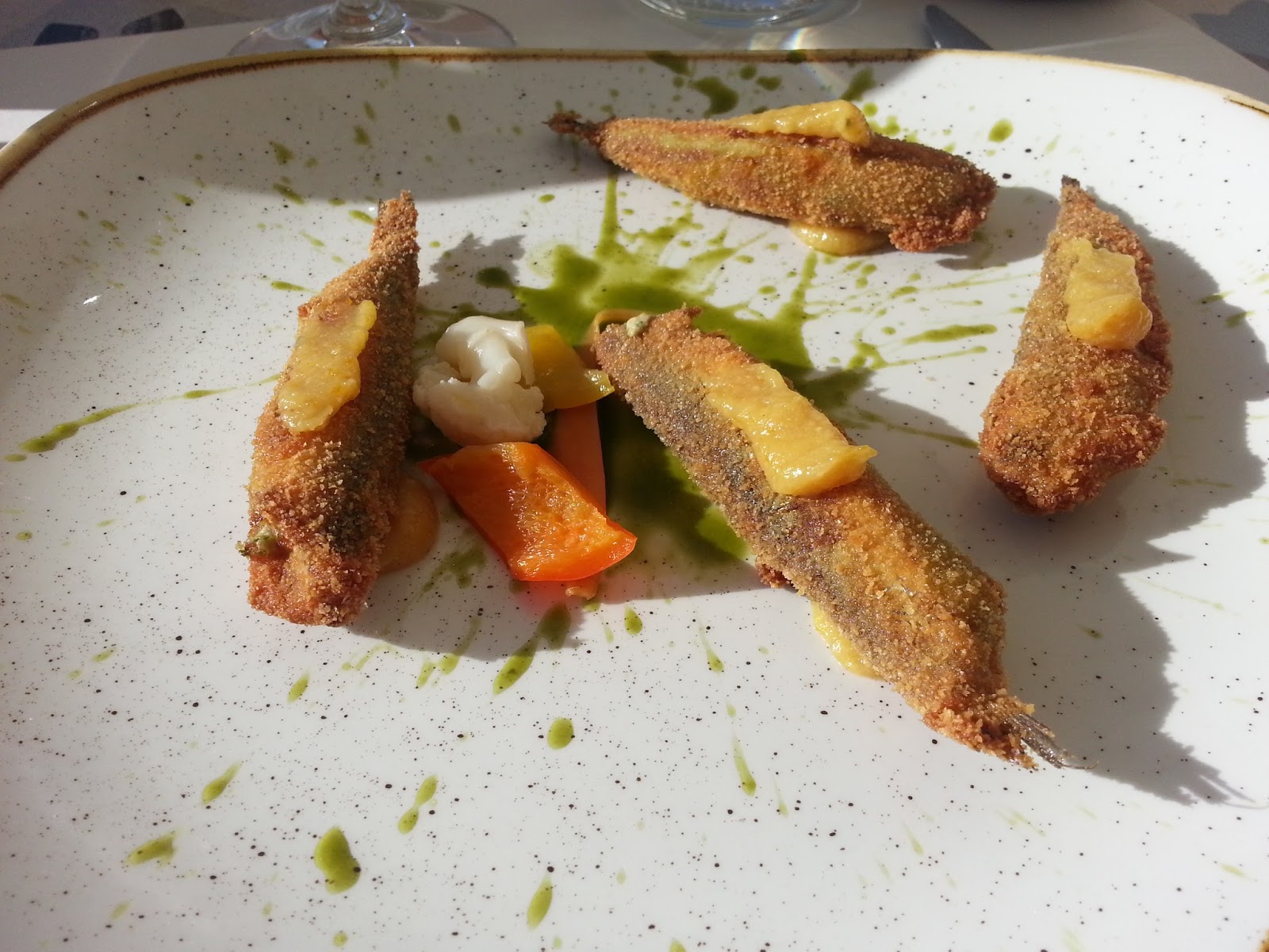 Acciughe ripiene di pesto fritte, clorofilla di prezzemolo,